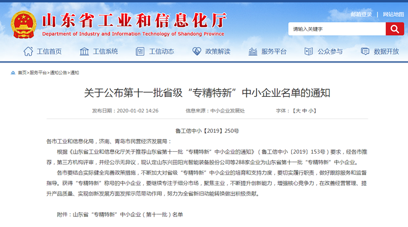 根據(jù)《山東省工業(yè)和信息化廳關于推薦山東省第十一批“專精特新”中小企業(yè)的通知》(魯工信中小〔2019〕153號)要求,經各市推薦,第三方機構評審,并經公示無異議,認定我公司山東興田陽光智能裝備股份公司為山東省第十一批“專精特新”中小企業(yè)。