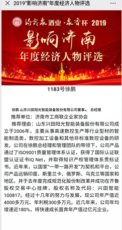 鑒于我公司在科技創(chuàng)新發(fā)展中做出的貢獻,由濟南市工商聯(lián)企業(yè)家協(xié)會推薦,經(jīng)組委會嚴格審核,我公司總經(jīng)理徐鵬成功入圍2019“影響濟南”年度經(jīng)濟人物候選人。