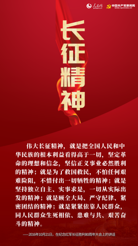 長征精神,是中國共產(chǎn)黨人和人民軍隊革命風范的生動反映,是中華民族自強不息的民族品格的集中展示,是以愛國主義為核心的民族精神的最高體現(xiàn)。長征精神為中國革命不斷從勝利走向勝利提供了強大精神動力。繼承和發(fā)揚長征精神,對于建設有中國特色的社會主義,實現(xiàn)中華民族偉大復興的強國夢,具有重大意義。